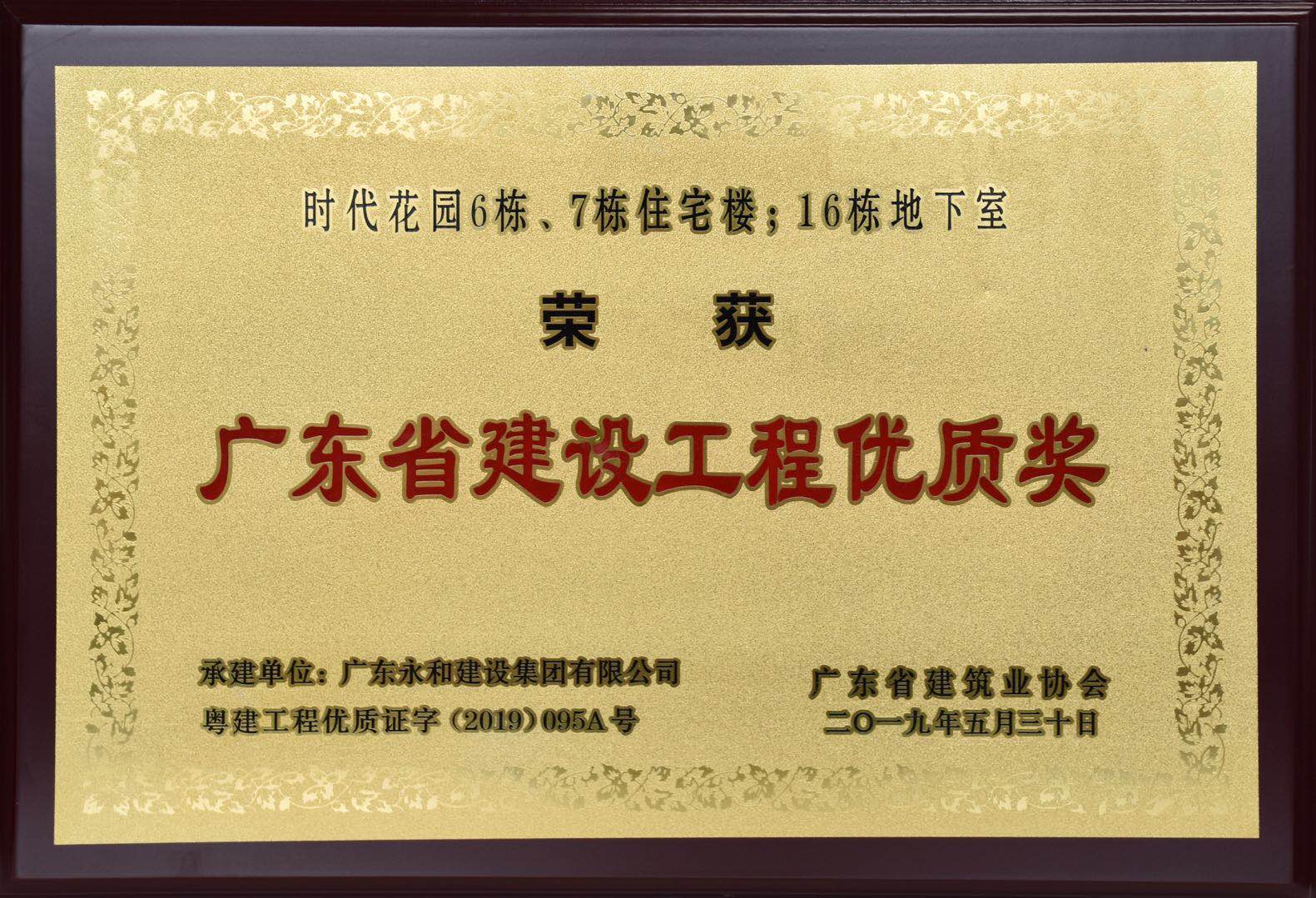 2019年,永和建设集团承建的时代花园6栋、7栋住宅楼、16栋地下室项目荣获“2019年度广东省建设工程金匠奖”和“2019年度广东省建设工程优质奖”。这是继该项目获“广东省安全生产文明施工示范工地”、“广东省建设工程优质结构奖”后,再次获得的重要荣誉。