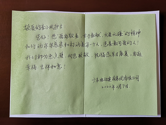 广东电白建设集团领导得知家乡抗疫护士李小凤 的感人事迹后,深受感动,十分牵挂和关心李小凤及其家属的情况。2月7日,集团领导特别委派公司代表,与茂名市电白区卫生健康局、茂名市电白区红十字会工作人员一起前往电白区观珠镇李小凤家中,看望慰问李小凤的家属,送上10000元慰问金及慰问品,祝愿李小凤早日康复,保重身体,并嘱咐李小凤家属安心生产和生活,照顾好家庭。